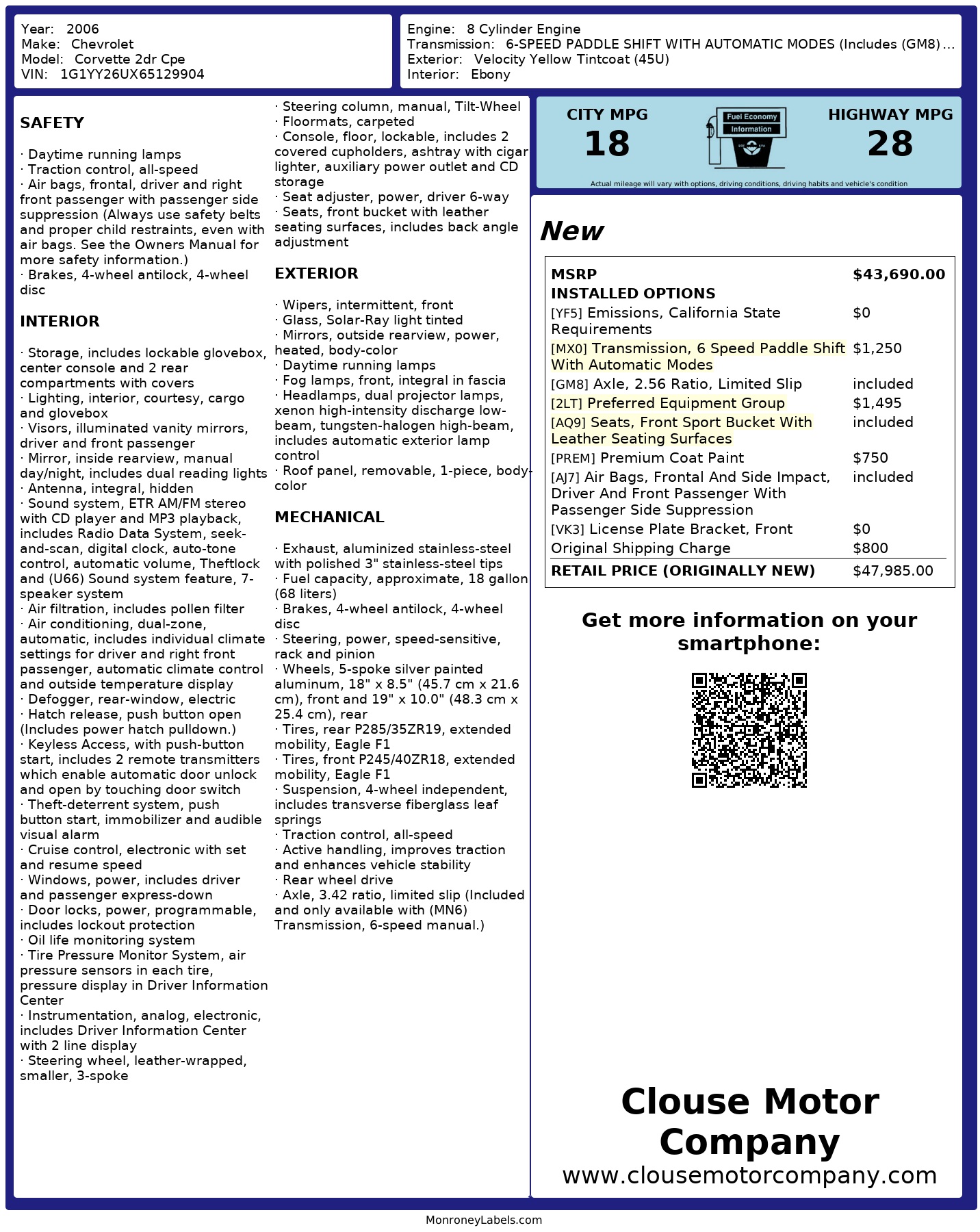 2006 CHEVROLET CORVETTE COUPE 6.0L - For more information on this vehicle or extended warranty information please call 417-862-2299, and watch our website for daily inventory updates. We can also help facilitate bank financing for you, but do not offer any in-house payment plans. Dont forget to click the Carfax button for your free vehicle history report! Thanks for looking and God bless!